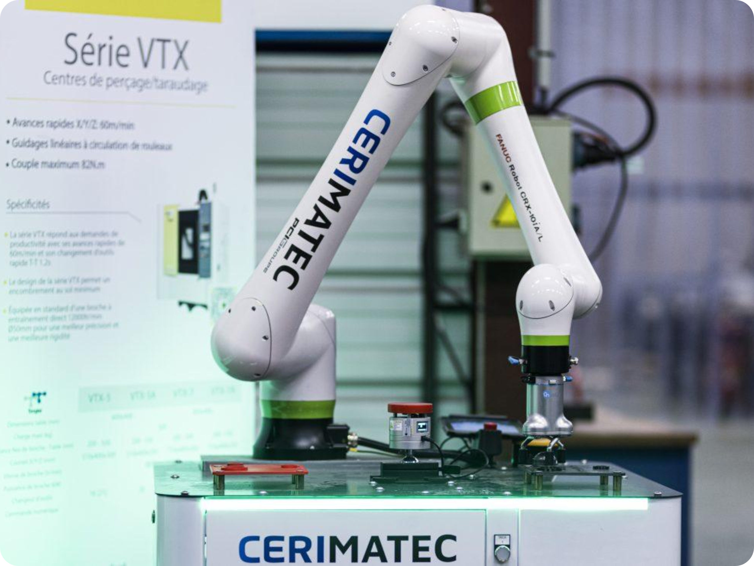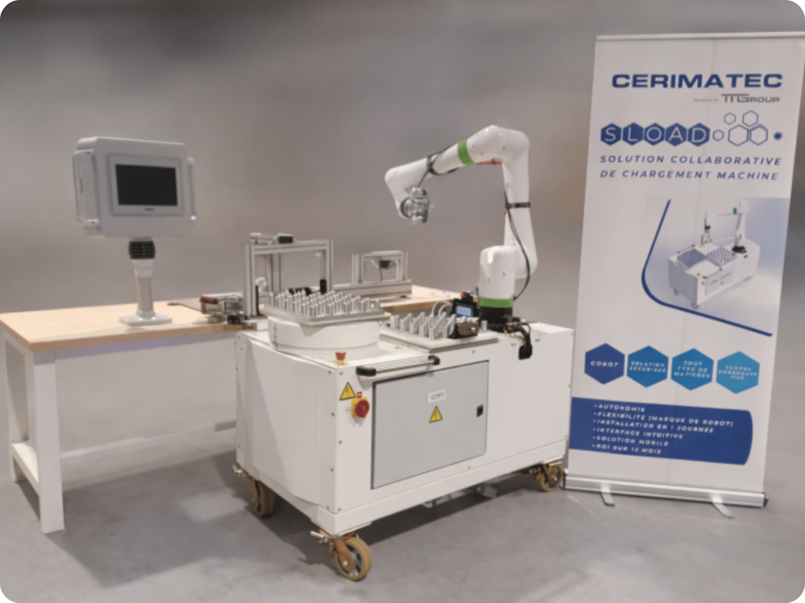 Le S:LOAD de CERIMATEC est une solution collaborative autonome destinée au chargement/déchargement de machines. Conçu pour évoluer au plus près des opérateurs, sans barrière physique, ce cobot allie performance industrielle, sécurité d’usage et flexibilité d’intégration.